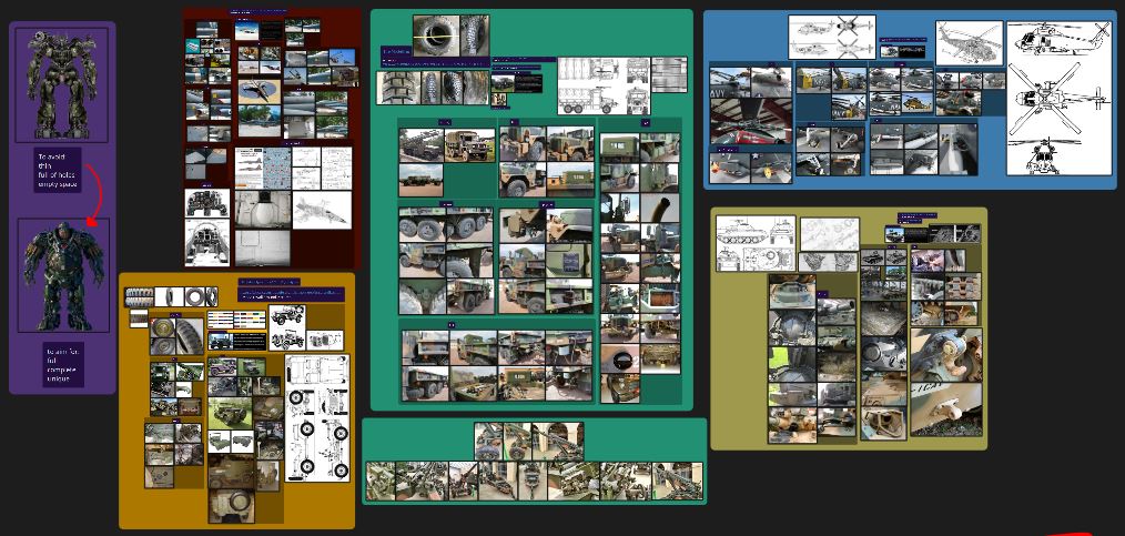 Above we have the initial reference gathering for my Honours project - 'Bruticus Online', the redesiging of the Transformers character Bruticus into the same high quality as the live action movies. My inital stages of reference gathering focused on the 5 vehicles that make up the character itself, aiming to have enough high quality images to begin concepting.